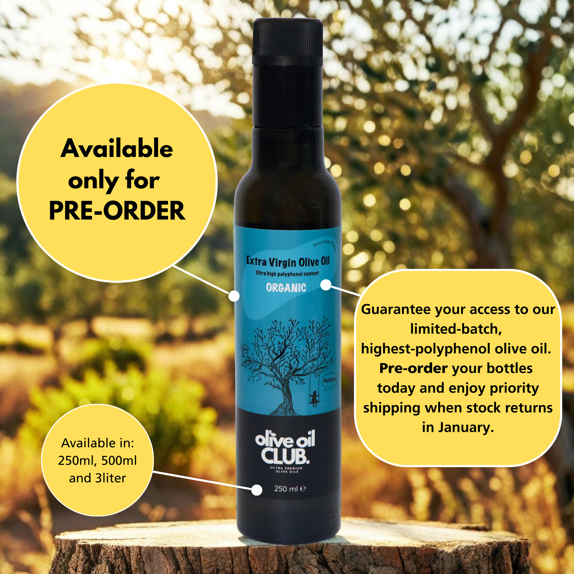 What is a pre-order? A pre-order allows you to purchase your olive oil before the new stock arrives. This ensures that your order is prioritized and fulfilled as soon as the shipment reaches our warehouse in January.