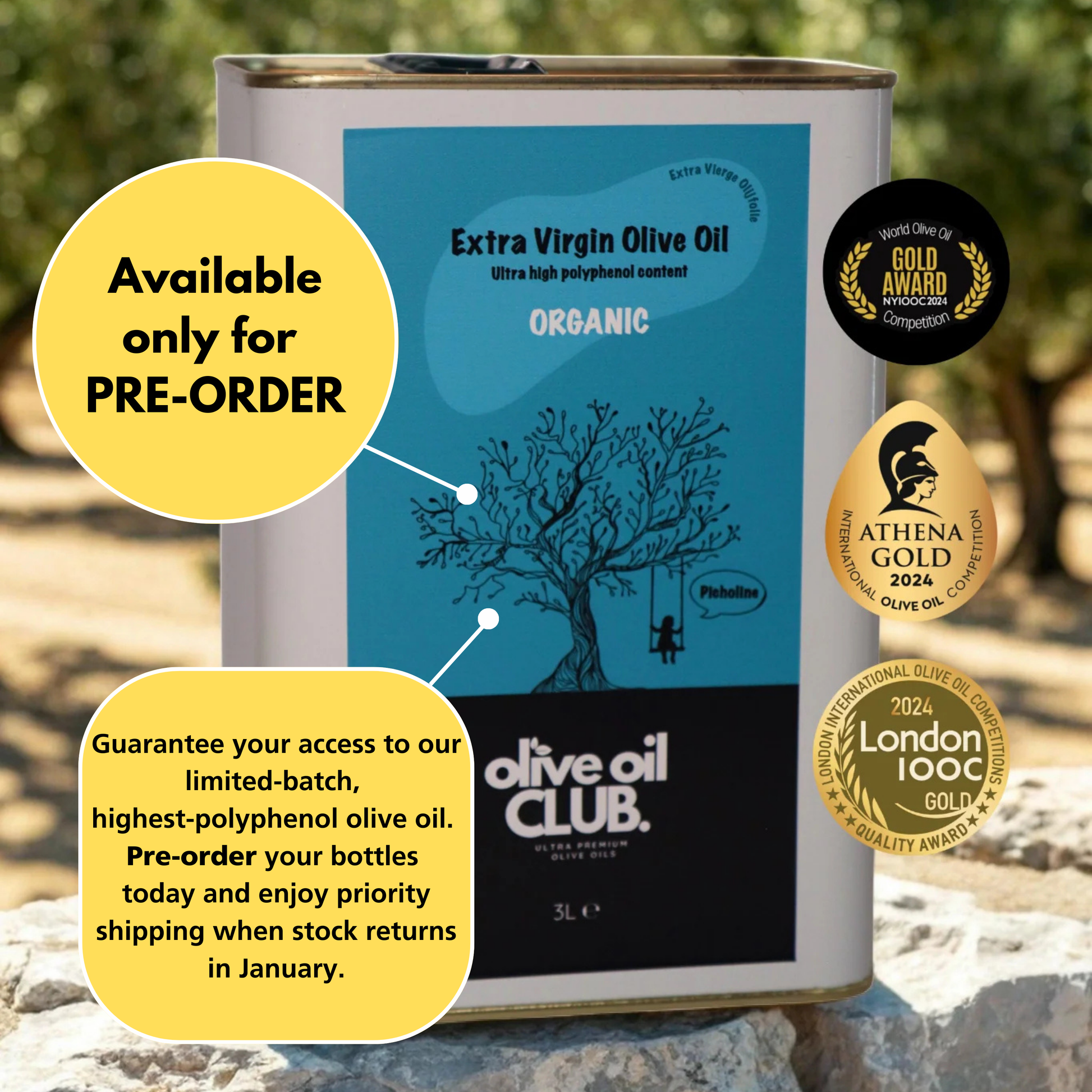 Our Picholine olive oils are currently out of stock, but a fresh shipment is arriving in January. To make sure you have access to our olive oils with the highest levels of polyphenols, we are offering pre-orders, a simple way to reserve your bottles in advance.